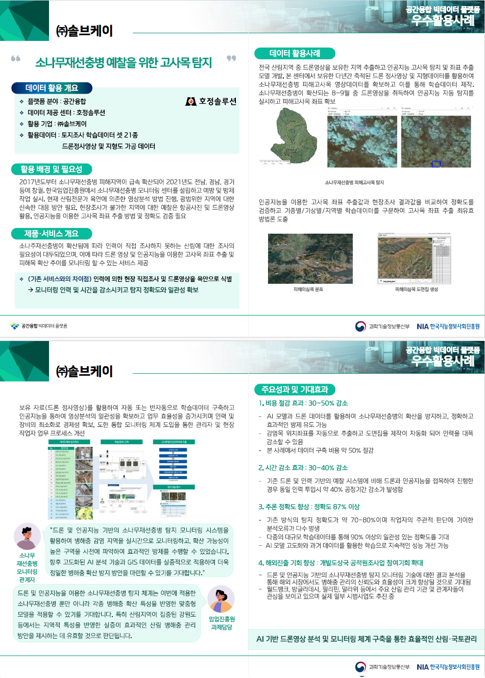 - 드론 기반의 고품질 시각데이터를 구축하고 인공지능, 디지털 트윈 등과 연계하여 서비스를 할 수 있도록 학습데이터 셋을 제공하여 서비스에 활용 - 국내 토지이용현황과 관련된 조사들로 지목조사, 용도지역·지구·구역 등을 자동 분류하여 활용할 수 있는 서비스에 활용 |