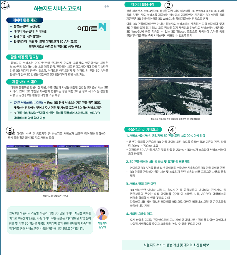 ○ 특광역시도별 아파트 단지 3D API 1. 설명 - 특광역시도별 아파트 단지 건물 3D 모델 데이터 API 2. 갱신방법 - 수시 3. 상품구매 및 이용방법 - 가격, 상품구매 및 이용방법 문의를 판매 담당자 연락처 혹은 이메일로 남겨주시면 담당자가 전화 또는 이메일로 안내해 드립니다. - 가격은 특광역시도별로 별도 책정됩니다. |